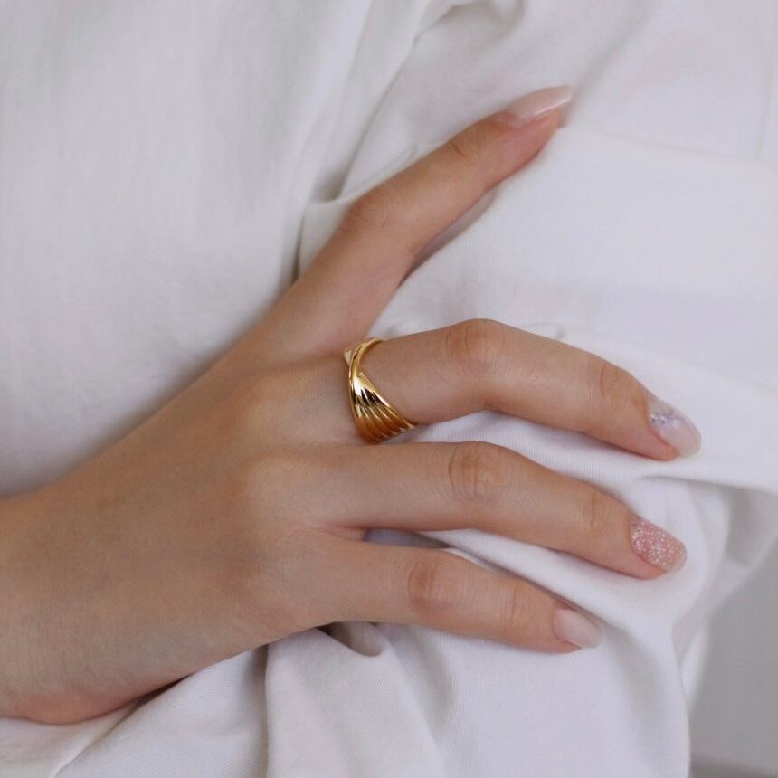 縞模様が刻まれて指を包む感じのデザインも、手元を綺麗に見せてくれます。カジュアルにデイリーの指輪としても◎
