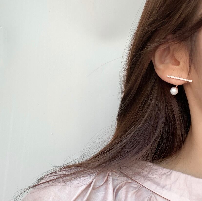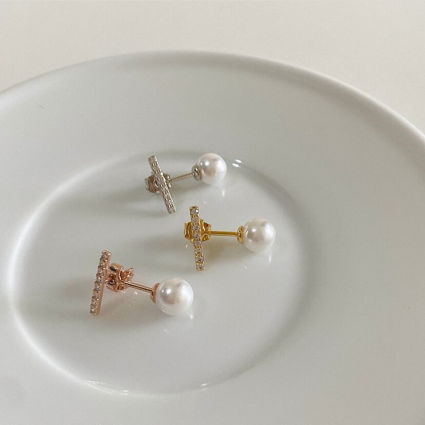 長さの違う2本のスティックにパールのキャッチがついた女性らしい高級感のあるピアス