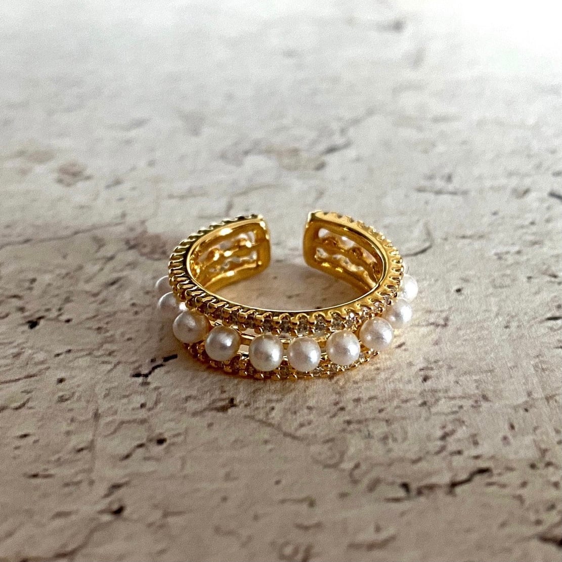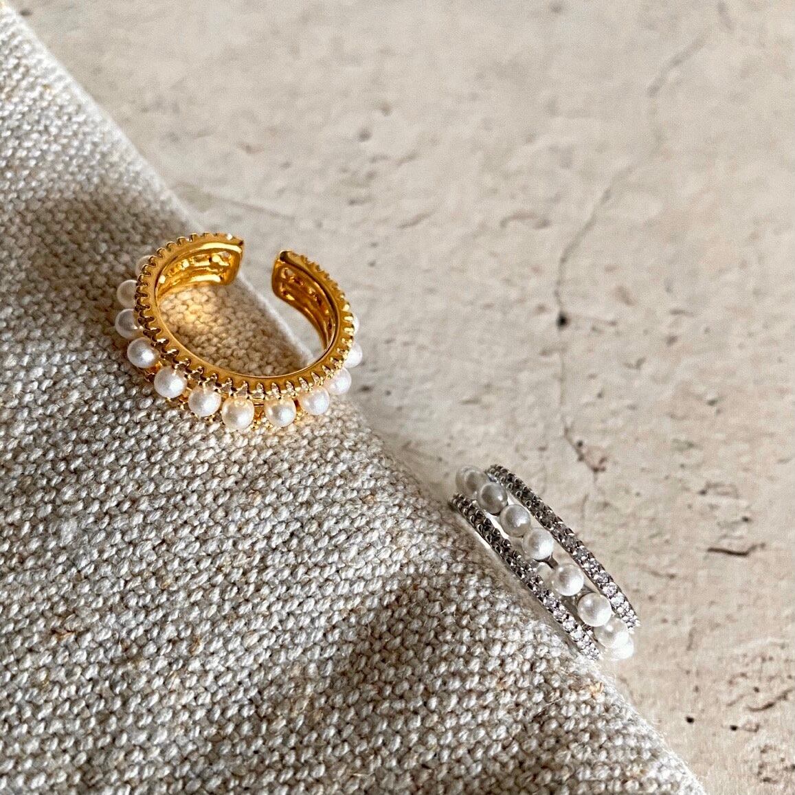 キラキラ光るキュービックジルコニアでパールを挟んだハイクオリティリング